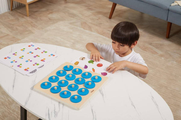 This traditional memory game features a durable wooden case, 16 wooden covers, and 5 double-sided game cards. Players take turns removing two covers at a time, keeping them if the patterns match. The player with the most covers at the end wins. The game includes patterns of shapes, fruits, animals, vegetables, emotions, and more, with 3 levels of difficulty for extended play. It is created to enhance memory skills and fine motor abilities, while promoting quality bonding time between friends, family, and children.